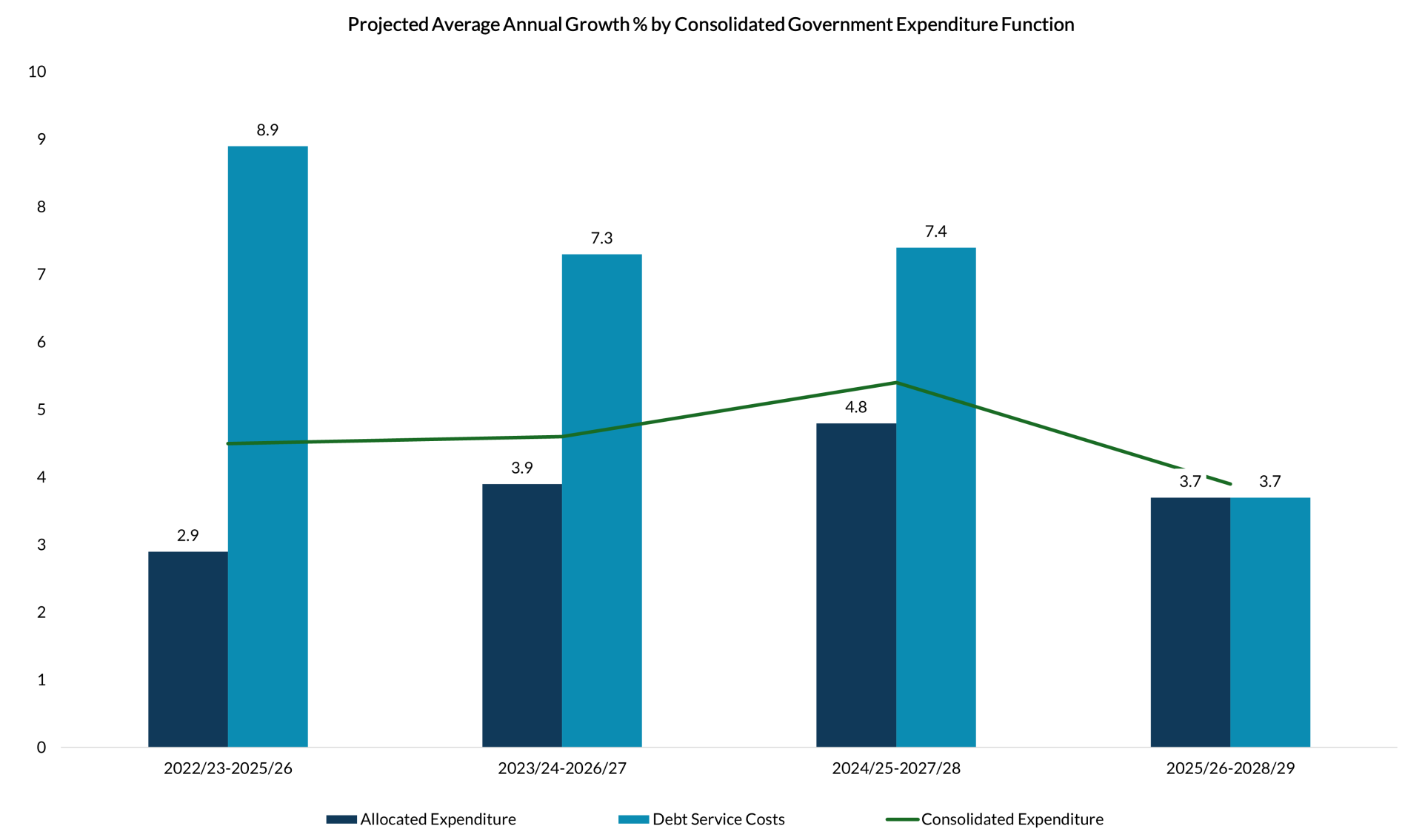 However, under the most recent projections, debt-service costs are expected to grow at 3.7 per cent in 2025/26–2028/29, down from 7.4 per cent in the previous projection window, and no longer materially faster than allocated expenditure, which declines from 4.8 per cent in 2024/25–2027/28 to 3.7 per cent in 2025/26–2028/29.