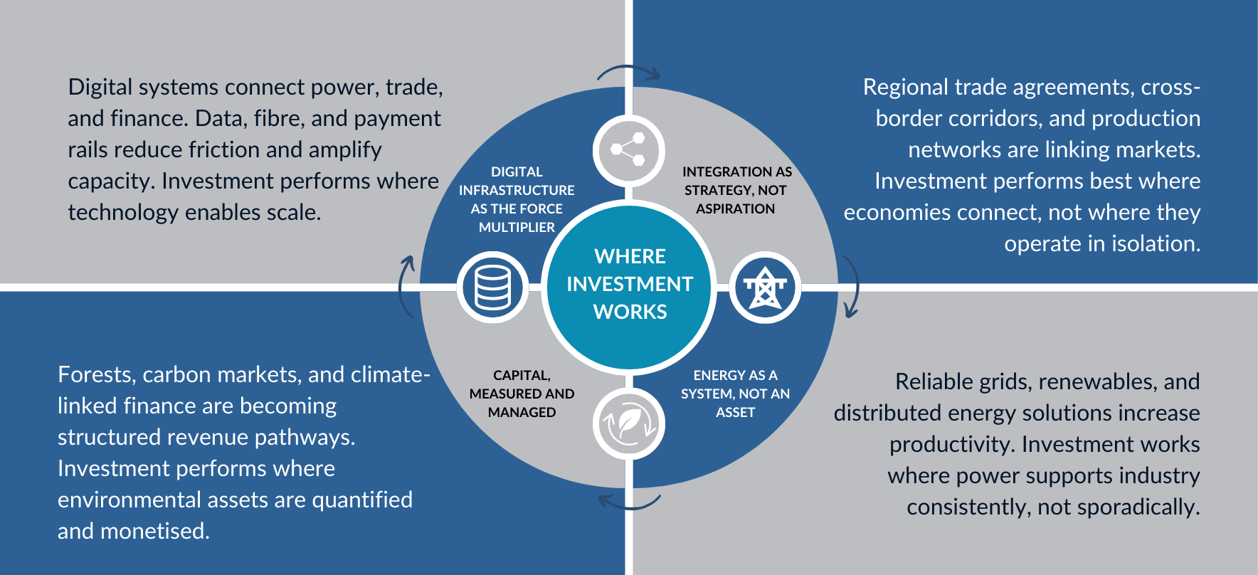 At the same time, digital governance platforms, from e-procurement systems to digital land registries, reduce friction, increase transparency, and lower transaction costs, in line with the World Bank’s Digital Economy for Africa (DE4A) framework. Governance, when data-driven and enforced, functions as infrastructure in its own right. These institutional foundations determine whether investment outcomes extend beyond balance sheets into the real economy.
