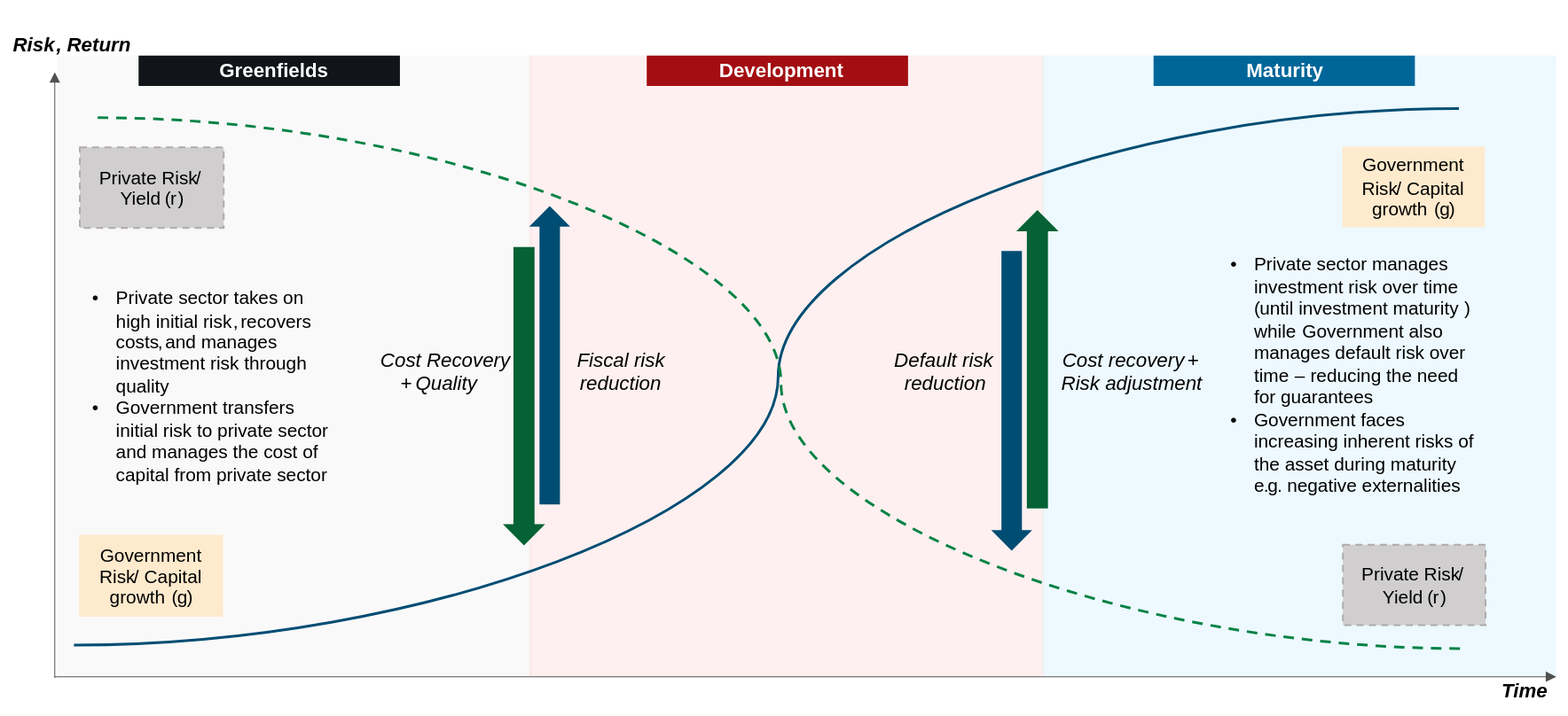 The risk-return interplay across infrastructure follows a recognisable lifecycle Figure 2. In early-stage or greenfield environments, private capital demands elevated yields because uncertainty is highest. Construction risk, policy volatility, and revenue unpredictability are priced aggressively. At this stage, governments often absorb part of the exposure through guarantees or balance sheet support, effectively transferring initial risk to the public sector to attract private participation. The cost of capital reflects that uncertainty.